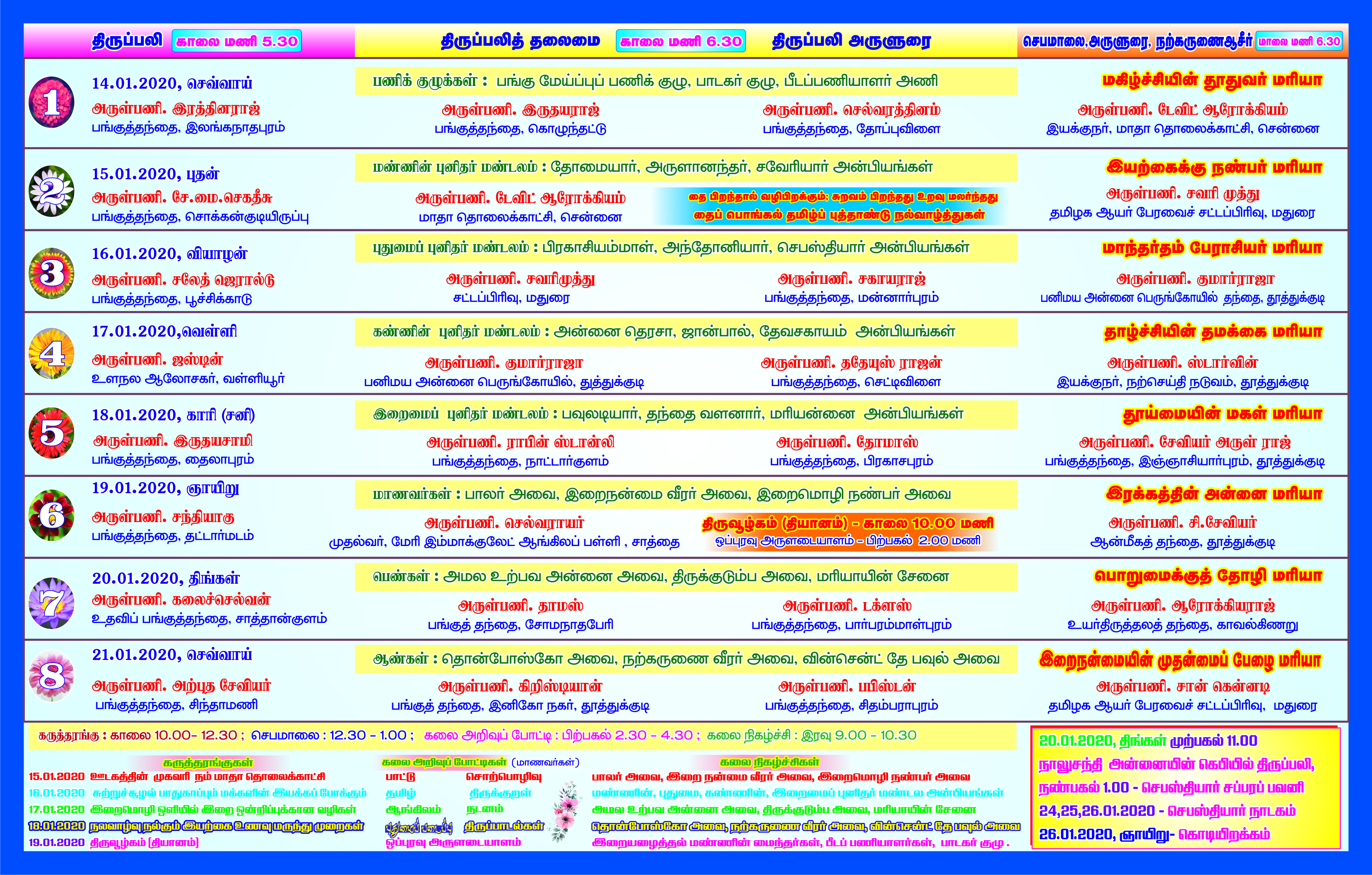 - Day 1: Jan 14 - Blessing and Flag Hoisting followed by Mass 7:30 pm